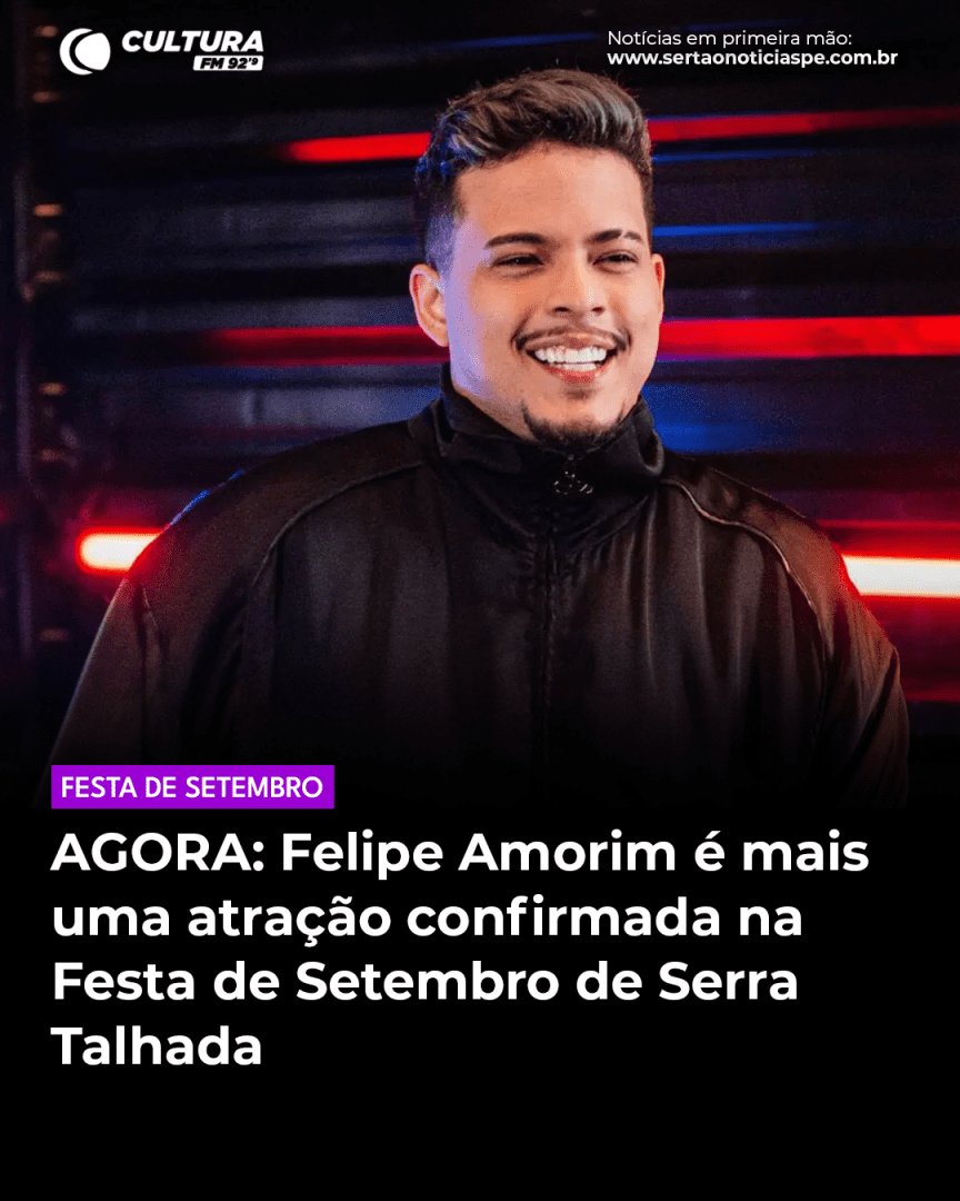 A Festa de Setembro em Serra Talhada segue ganhando corpo e empolgando o público com novas confirmações. A mais recente atração anunciada é o cantor Felipe Amorim, um dos maiores nomes do momento, conhecido por seu estilo que mistura piseiro, forró e batidas envolventes. Ele promete levantar o público com seus principais sucessos.