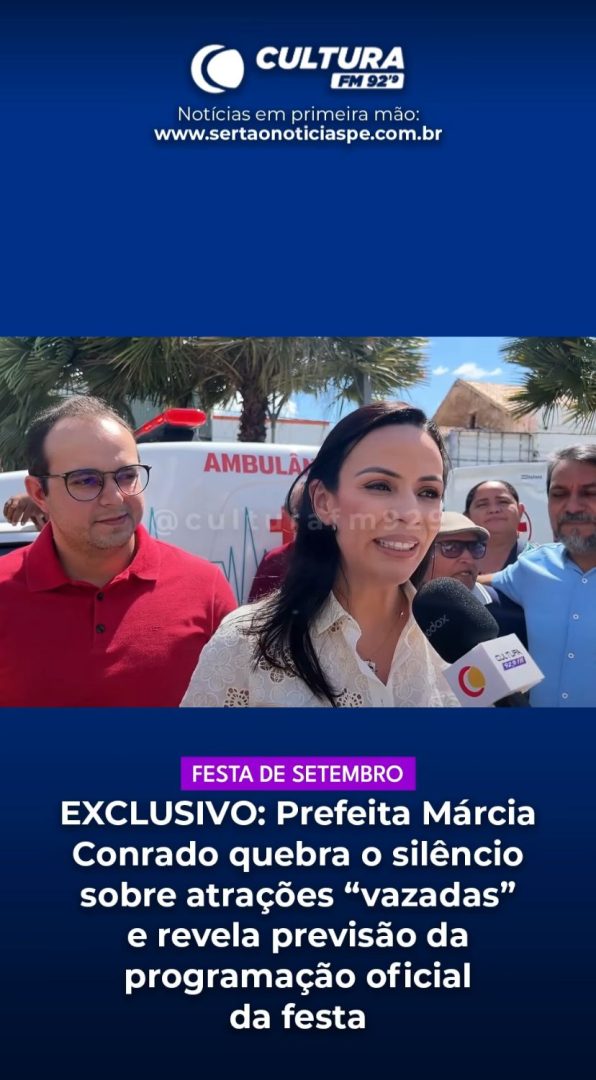 A prefeita Márcia Conrado falou com exclusividade sobre as especulações que têm circulado nas redes sociais a respeito das atrações da festa da padroeira de Serra Talhada. Segundo ela, ainda estão finalizando detalhes burocráticos e acertando com patrocinadores, mas garantiu que o evento será um dos melhores já realizados.