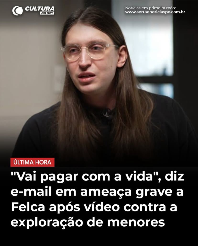 A defesa do influenciador Felipe Bressanim Pereira, conhecido como Felca, afirmou que ele vem recebendo diversas ameaças desde a publicação de um vídeo em que denuncia casos de pedofilia e de adultização de crianças e adolescentes.