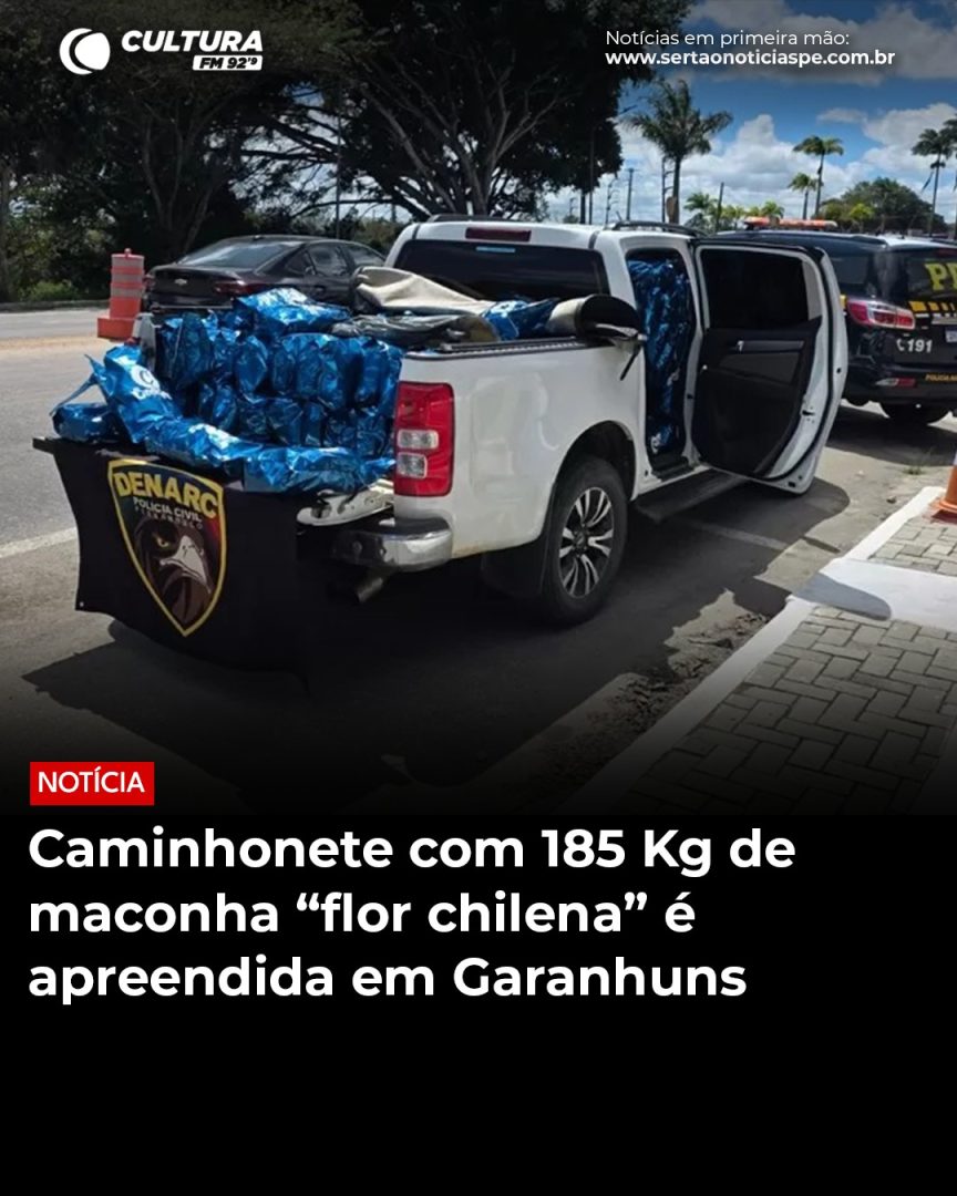 Na manhã desta terça-feira (12), uma ação conjunta da Polícia Rodoviária Federal (PRF) e das Delegacias de Repressão ao Narcotráfico de Garanhuns e Petrolina (8ª e 12ª DPRN/DENARC) resultou na apreensão de 185 quilos de maconha do tipo “flor chilena”. A droga era transportada em uma caminhonete, interceptada no Km 100 da BR-423, em Garanhuns, no Agreste de Pernambuco.