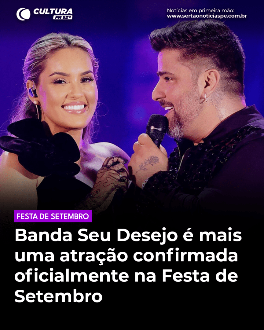 A tradicional Festa de Setembro, em Serra Talhada, acaba de ganhar mais uma grande atração em sua programação oficial: a banda Seu Desejo. O grupo, que vem conquistando o público com sucessos no cenário nacional, promete levantar o público na maior celebração cultural do município.