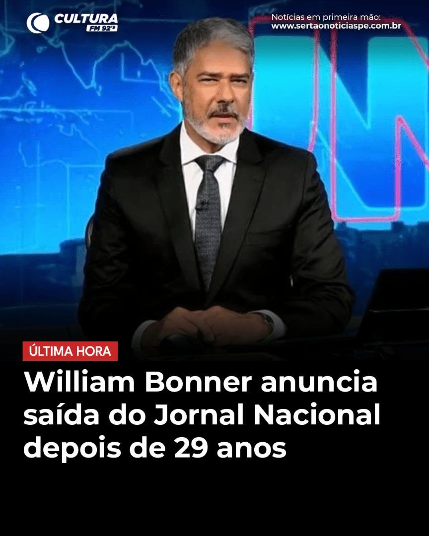 O jornalista William Bonner anunciou que vai se despedir da bancada do Jornal Nacional após quase três décadas à frente do principal telejornal da TV brasileira. A mudança acontece a partir de 2026, quando ele passará a apresentar o Globo Repórter ao lado de Sandra Annenberg.