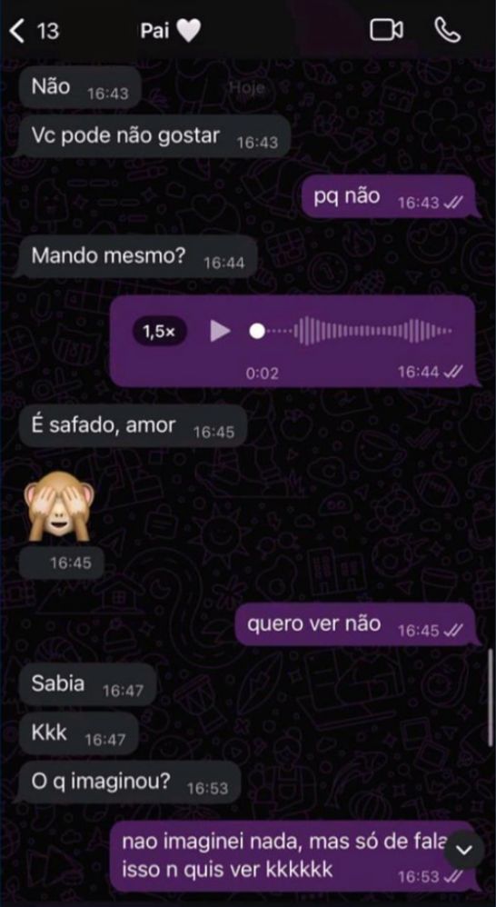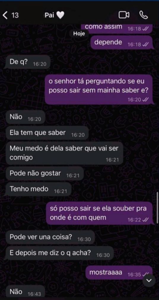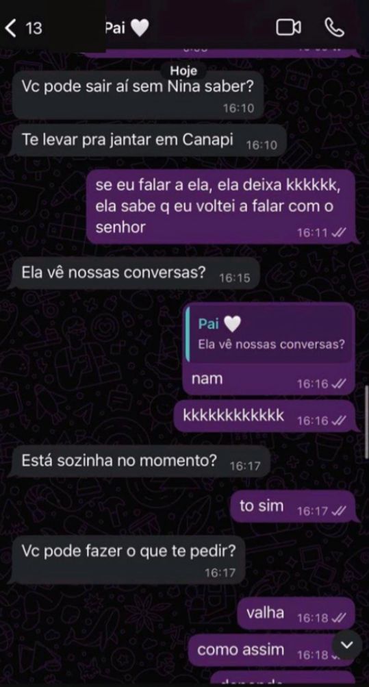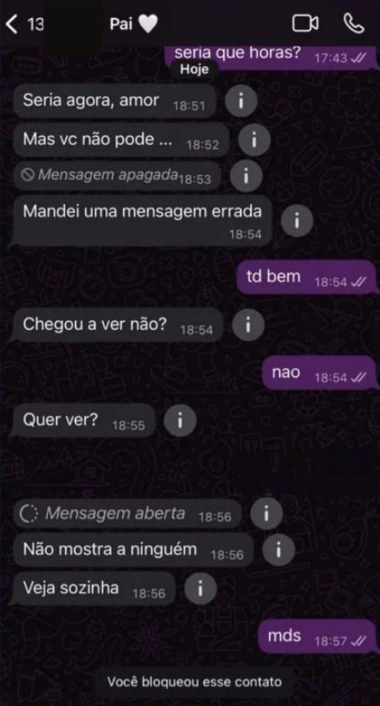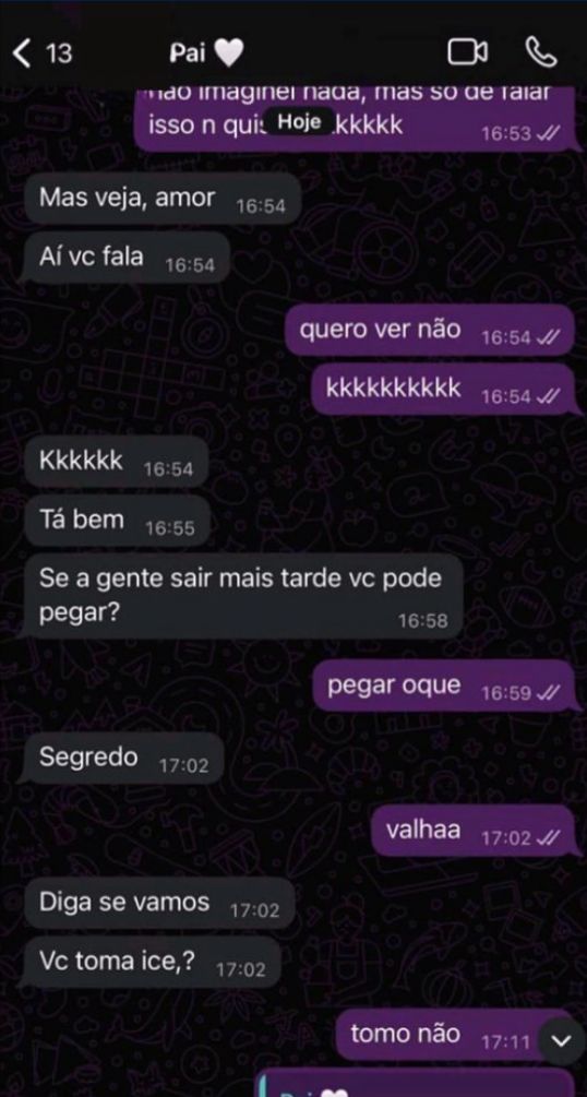 De acordo com a vítima, após retomar o contato com o pai, ela começou a receber mensagens inapropriadas. Nas conversas, o homem pedia para se encontrar com a adolescente às escondidas da mãe.
