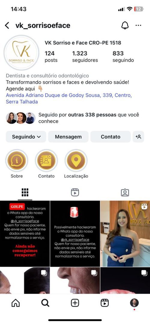 Serra Talhada (PE) – Os proprietários da clínica odontológica VK Sorriso e Face, Dr. Vinícius Florentino e Dra. Katarina Alencar, divulgaram um alerta importante à população após o número de WhatsApp da clínica ser invadido por golpistas.