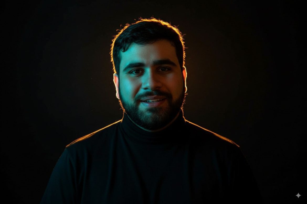 Iluminação: contraluz quente + fonte fria sobre o rosto, criando contraste dramático.