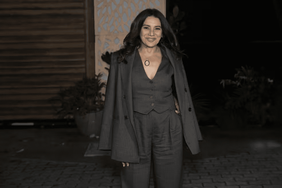 Dira Paes chegou deslumbrante, usando um conjunto acinzentado com blazer e calça da mesma cor, além de um colar com pingente que remete à estátua símbolo da novela. O visual elegante e sofisticado conquistou o público e se destacou entre os convidados.